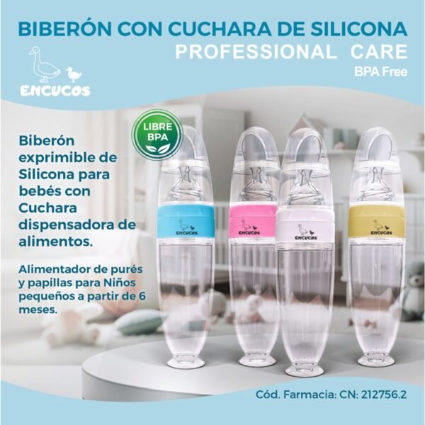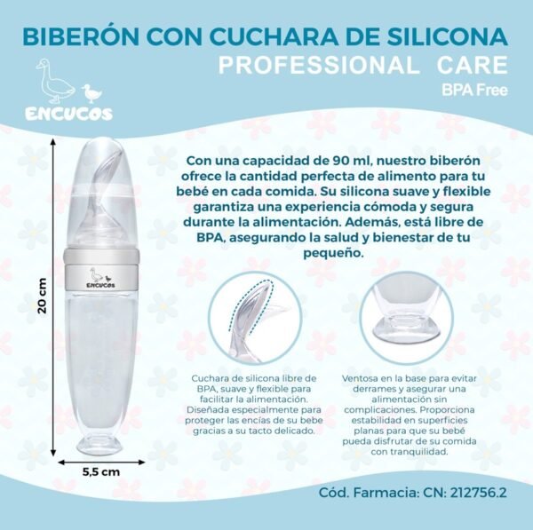 ¡La solución perfecta para alimentar a tu bebé! Nuestro biberón con cuchara de silicona cuenta con una ventosa en la base para evitar derrames. ¡Una madre feliz y su bebé disfrutan de comidas sin preocupaciones!