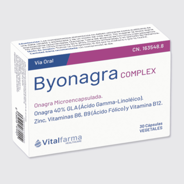 Byonagra es un complemento alimenticio a base de Onagra Microencapsulada 40% GLA (Ácido gamma-linoleico), Zinc y Vitaminas B6, B9 y B12.